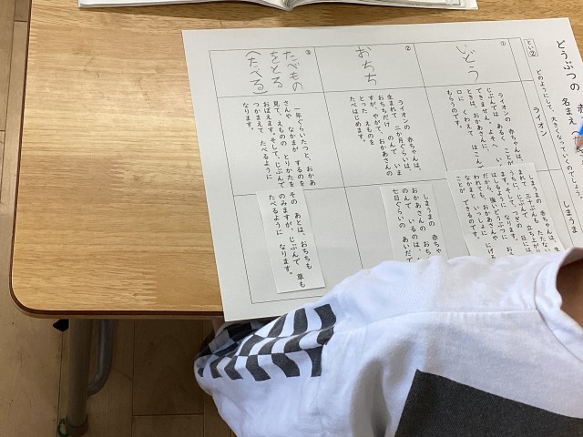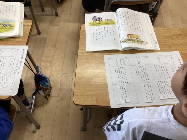 1年生の国語では説明文「どうぶつの赤ちゃん」の学習をしています。この時間には、しまうまの赤ちゃんの移動について、お乳について、食べ物をとることについて、ライオンの赤ちゃんと比べながら読み取りました。「教科書に〜〜と書いてあるよ。」などと、教科書の文を根拠にして発表、学級で話し合いながらまとめていきました。