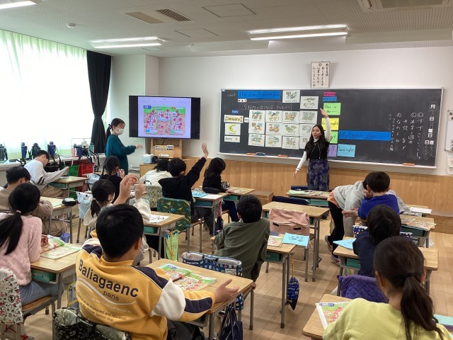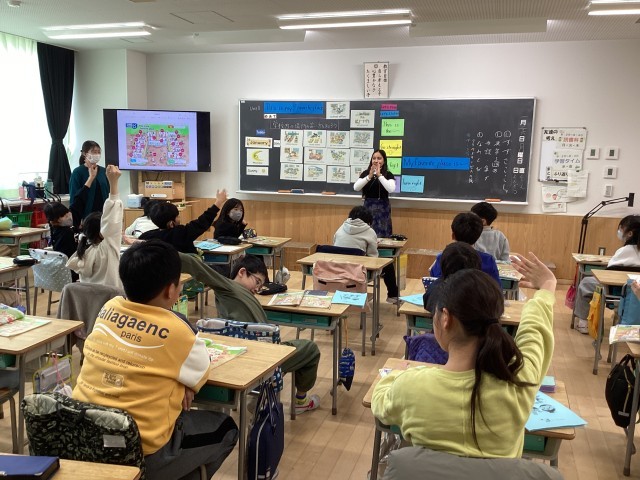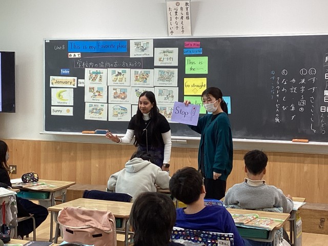 4年生の外国語活動では This is my favorite place. 「ここが私のお気に入りの場所です。」の学習をしています。My favorite place is library. 「私のお気に入りの場所は図書館です。」 My favorite place is gym. 「私は体育館が好きです。」などと校内の好きな場所について、ALTのあとについて発音してみました。ほかに Turn left. 「左に曲がってください。」Go straight. 「まっすぐ進んでください。」 Stop. 「止まれ」など、進む方向などの言い方も学びました。