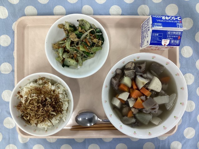 今週は、「よく噛む1週間」をテーマに給食を実施しています。今日は、かみごたえのある食材をたくさん使った献立にしました。チリメンジャコや刻み昆布で作ったカミカミふりかけは人気でした。一方で、ごぼうやレンコン、里芋や大根で作った和風ポトフは地味な見た目も影響し、残りが多かったです。