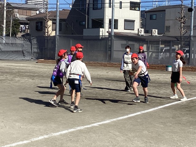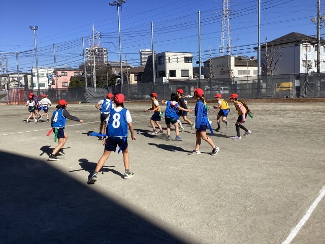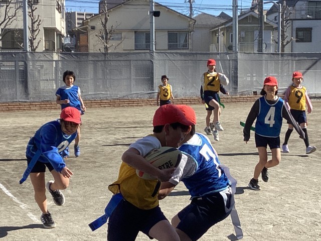 5年生の体育ではタグラグビーに取り組んでいます。攻め側は両腰につけたタグを取られたらタックルを受けたと同じでボールを動かすことができません。後方にしかボールを投げることができないので、戸惑う様子も見られましたが、声を掛け合いながらゲームを楽しんでいました。