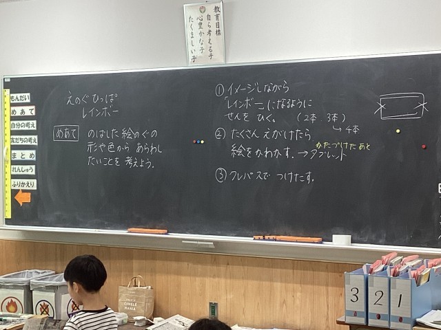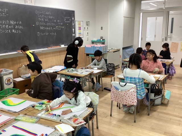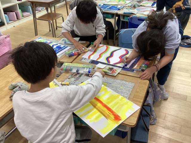 2年生の図工では「えのぐひっぱレインボー」の学習をしています。画用紙に数色の絵の具を出し、硬い紙でこするようにして引っ張ると、まるで虹のような模様ができあがります。「きれいでしょ。」などと話しながら楽しんでいました。この後、そのもようを何に見立てらられるか、自分の表したいものはどのようなものかを考えながらパスで描き足していきます。