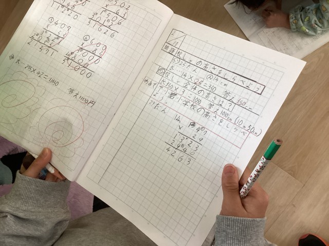 3年生は2けたのかけ算の学習をしています。校舎のおおよその高さを出してみようという学習に取り組んでいるクラスがありました。階段1段の高さを測り、それが何段あるかを調べて、かけ算を使って出していました。