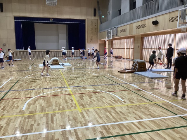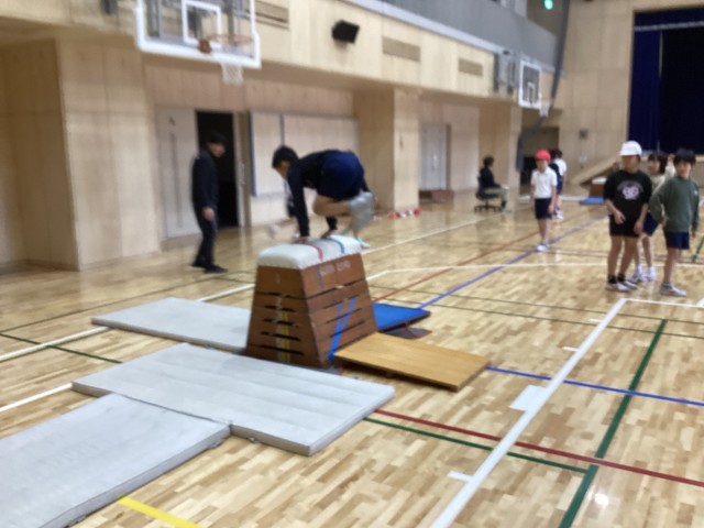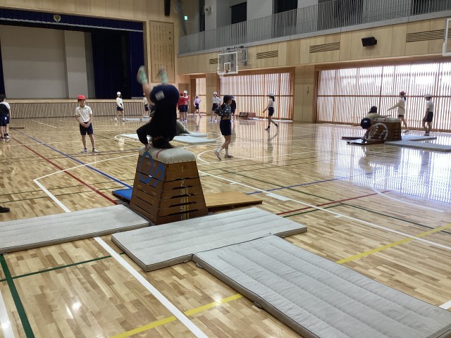 4年生の体育では跳び箱運動に取り組んでいます。跳び箱を横に置いたり縦に置いたりして、それぞれの力に合わせて開脚跳び、抱え込み跳びなどに挑戦しいています。