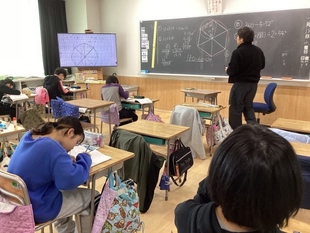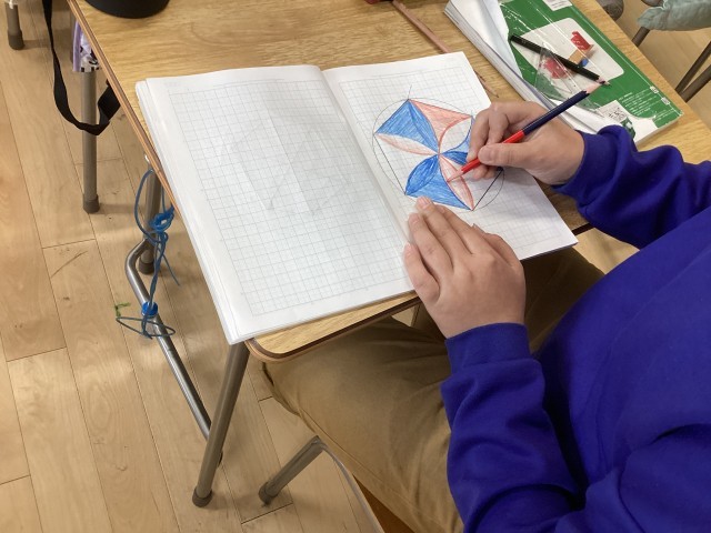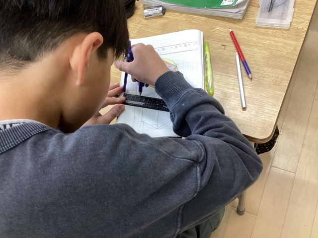 5年生の算数では「多角形と円」の学習で、正六角形をかく学習をしました。円をかくときに使った半径に開いたコンパスで円周を区切っていくと、正六角形ができることを学びました。また、中心角を区切っていくことで正五角形もかいてみました。