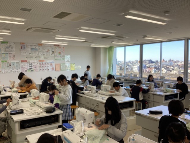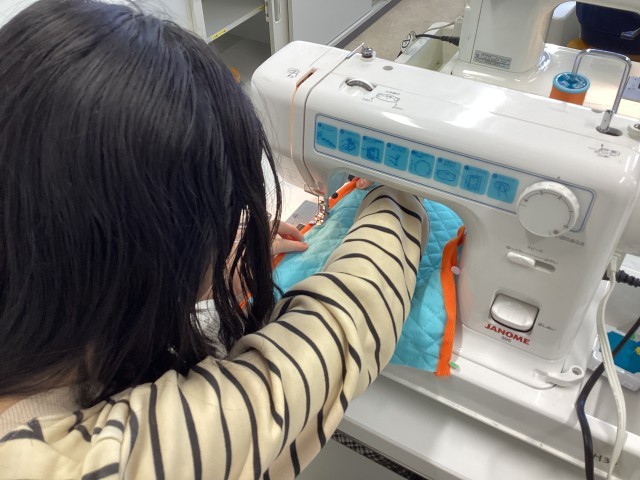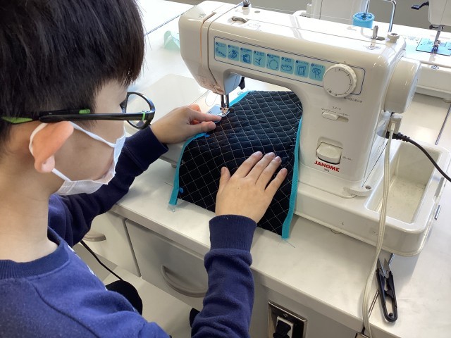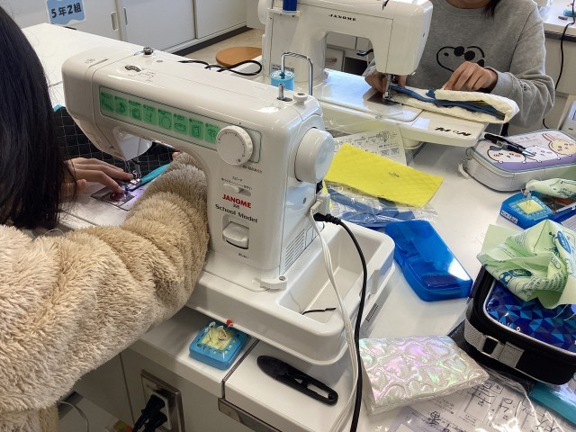 5年生の家庭科では「ミシンにトライ!手作りで楽しい生活」の学習で、ウォールポケット作りをしています。上糸の掛け方、下糸の出し方、返し縫いなどにも慣れて、ウォールポケット本体の端に綿テープを縫い付けました。慎重に取り組んでいます。