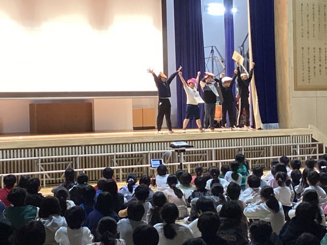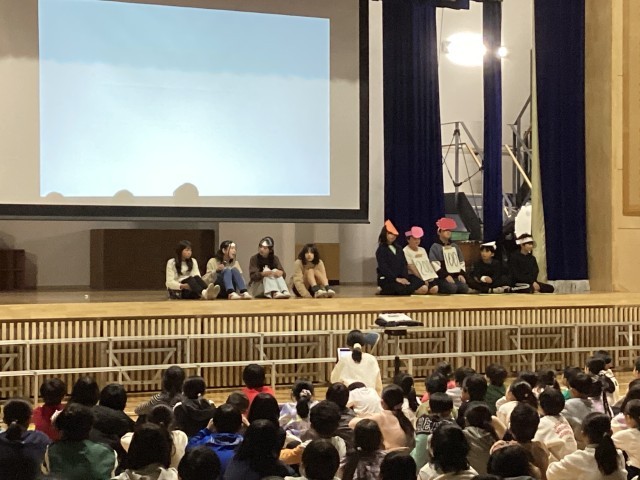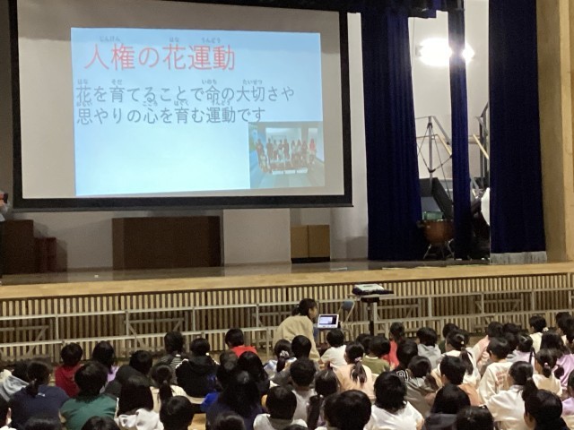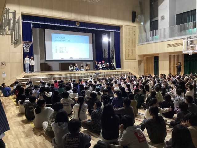 園芸委員会の発表がありました。花壇コンクールに参加しフラワーロードの花壇に花を植えたこと、人権の花活動でマリーゴールドや百日草を植えたこと、グリーンプラン推進校としてウェルカム花壇を作ったこと、そして日々水やりなどの手入れをしていることなど、1年間取り組んできたことを発表しました。また、水やりの頻度やどのような植物を植えたかなどについて、クイズを行いました。