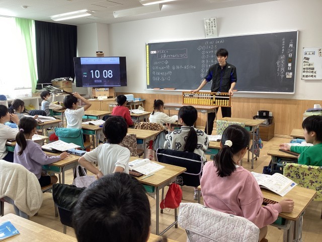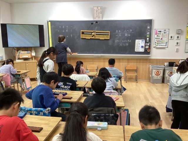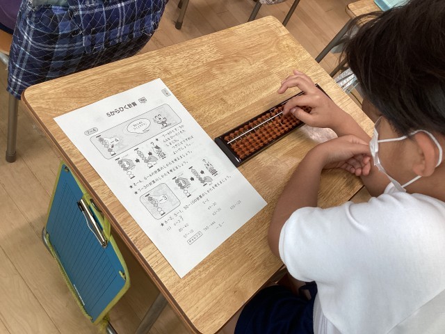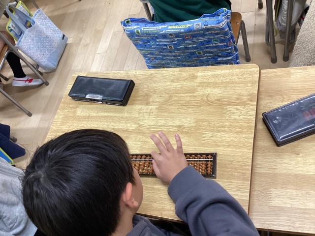 3年生の算数では、そろばんの学習をしています。各部の名前、上の玉は5を表し、下の4つの玉は1を表すことなど、基本を学んだ後、簡単なたし算やひき算を球を動かしながら計算しています。慣れていない子も多く、ひとつずつ確認しながら学んでいます。習っている子が友達に教える姿も見られました。