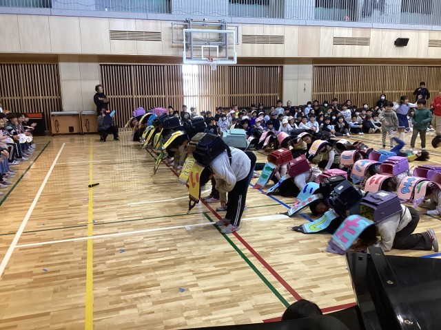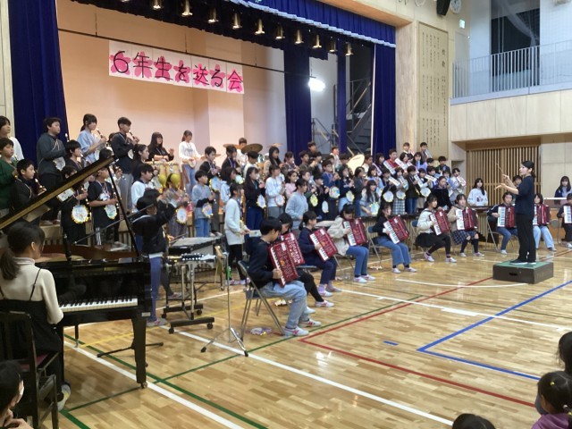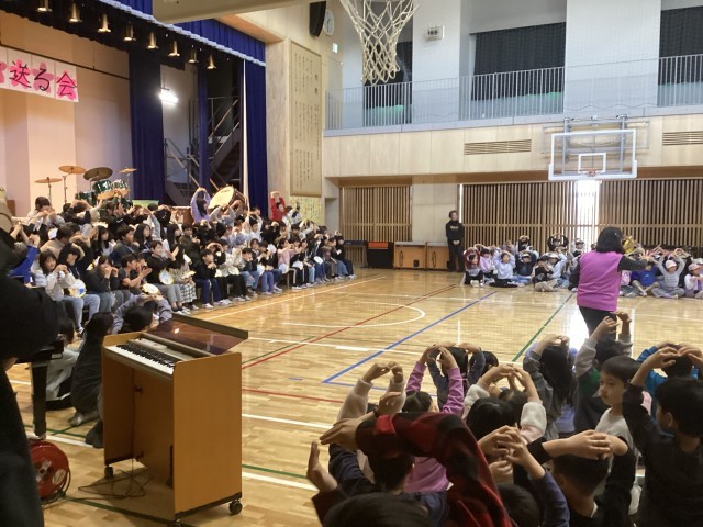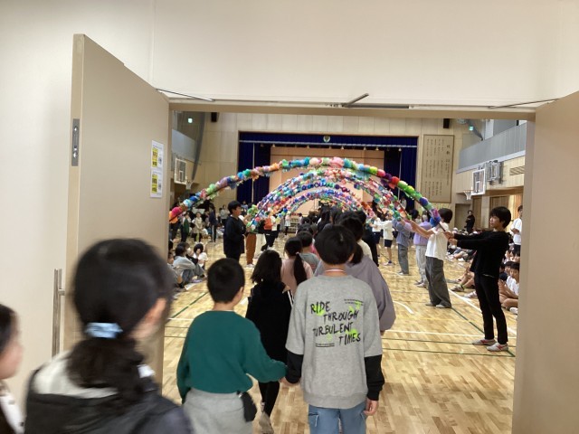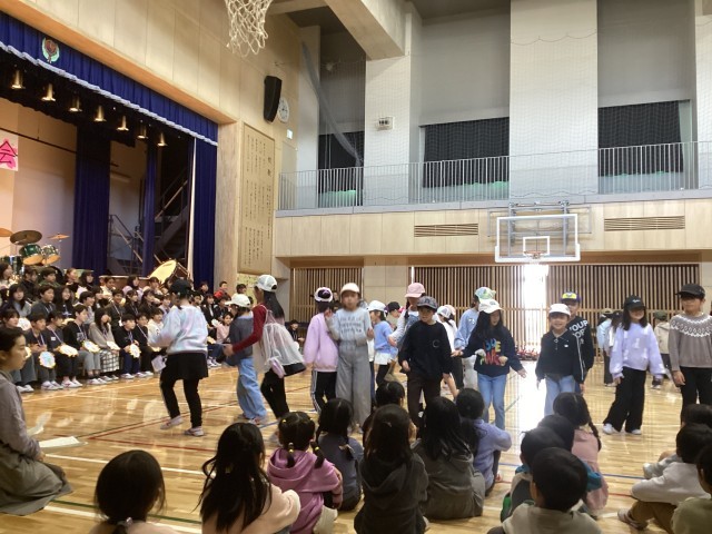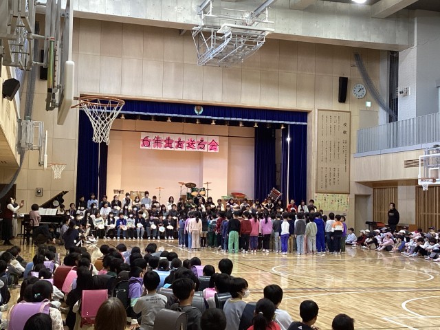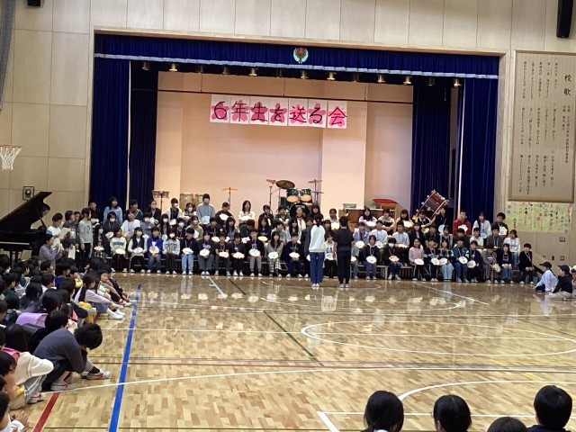 卒業を間近に控えて6年生を送る会を行いました。これまで下小岩小学校のリーダーとしてがんばってきた6年生に、感謝の気持ちと中学校に行ってもがんばってくださいという気持ちを各学年からの出し物で伝えました。1年生は6年生と手をついで入場、「きらきら星」の替え歌を贈りました。2年生は運動会で踊ったダンス「下小岩サイコー‼︎」を披露しました。3年生は「ゲームが得意な人」「スポーツが得意な人」などという題で借り物競走をしました。最後にランドセルを背負った3年生が礼をすると、メッセージが現れました。4年生は6年生クイズをしました。「中学校に行ってがんばろうと思っていることは?」という問いには「勉強」と答えた6年生が多かったです。その後「風になりたい」を合奏しました。5年生は6年生へのバトルを申し込みました。「しんにょうがつく漢字をたくさん出してください。」などという漢字対決、二重跳び対決、腕相撲対決を行いました。6年生からはお礼の言葉とアフリカンシンフォニーの合奏のお返しがありました。和やかで笑顔があふれる会になりました。