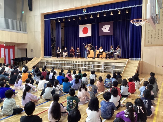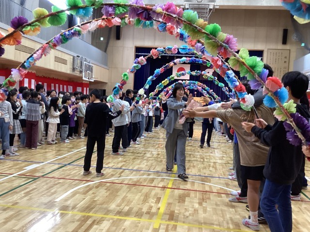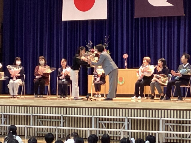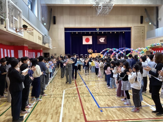 3月末で下小岩小学校を去られる先生、職員とのお別れの式を行いました。各学年代表児童がお礼の気持ちを込めて花束を渡しました。先生方からは日々の学校生活で感じた下小岩小学校の子どもたちのよいところの話、これからがんばってほしいことなど、メッセージをいただきました。最後は子どもたちの列の間、花のアーチの下を巡り、子どもたちとお別れをしました。