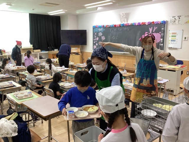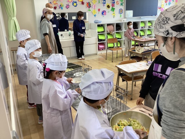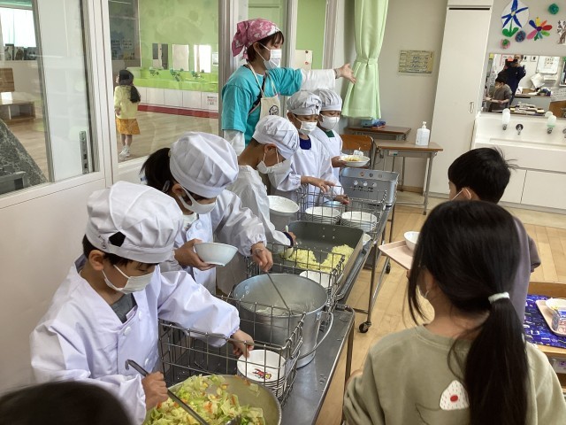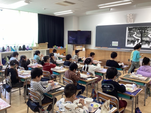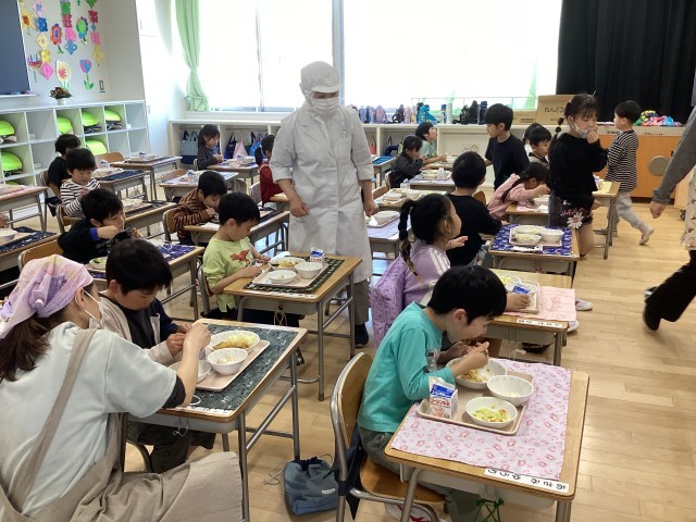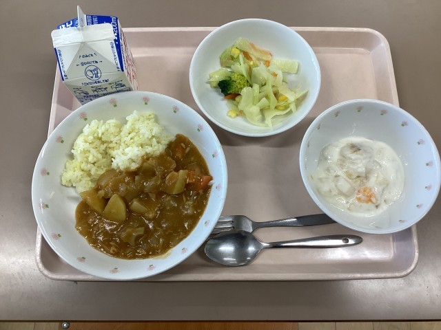 1年生の給食が始まりました。今日の献立は 根菜とツナのカレーライス コーンサラダ フルーツのヨーグルト添え です。給食当番は白衣を着て、ご飯、カレー、サラダ、デザート、牛乳などの担当に分かれ、盛り付けました。当番以外の子はトレーから食器を落とさないように気をつけながら受け取っていました。全員の準備ができたところで「いただきます」を言って食べ始めました。ほとんどの子が残さず食べることができました。ごちそうさまの後の片付けも順番にていねいに行なっていました。