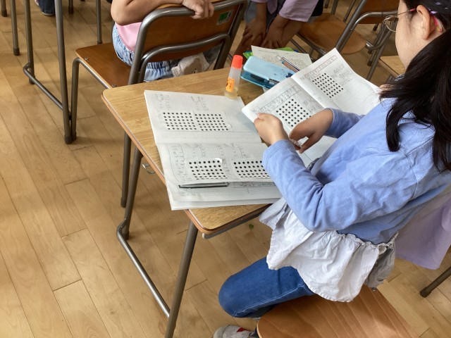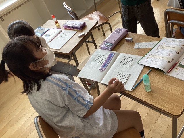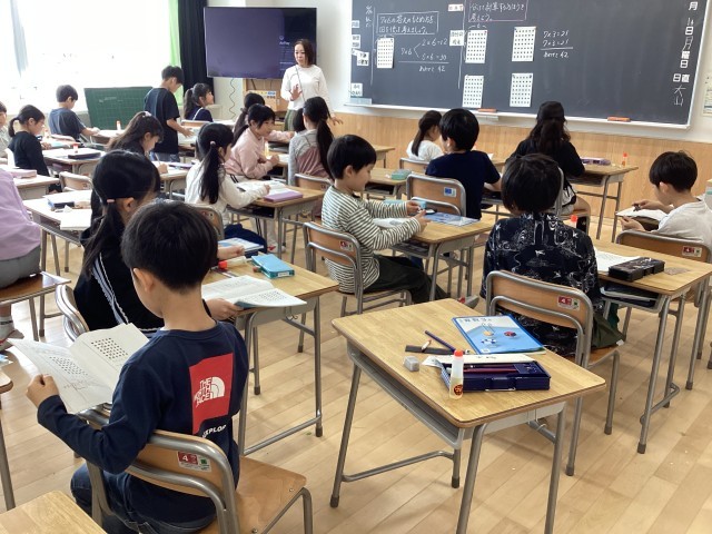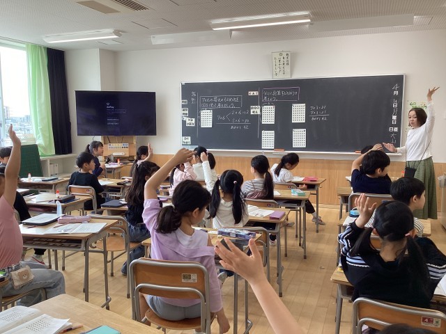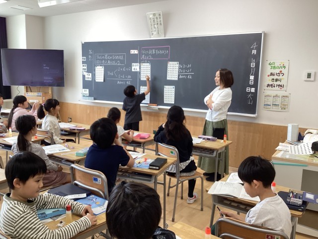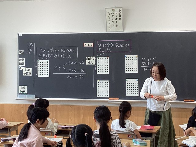 3年生の算数「かけ算のきまり」の学習では、2年生で学習したかけ算九九を使って学習をしています。この時間は「7×6の答えを別のかけ算を使って求めよう。」という問題を考えました。ドット図を使ってそれぞれが考え、発表しました。7×6=42は、7×3=21と7×3=21に分けて求めることができるというように考えます。いろいろなかけ算九九を使って42の出し方を考えました。