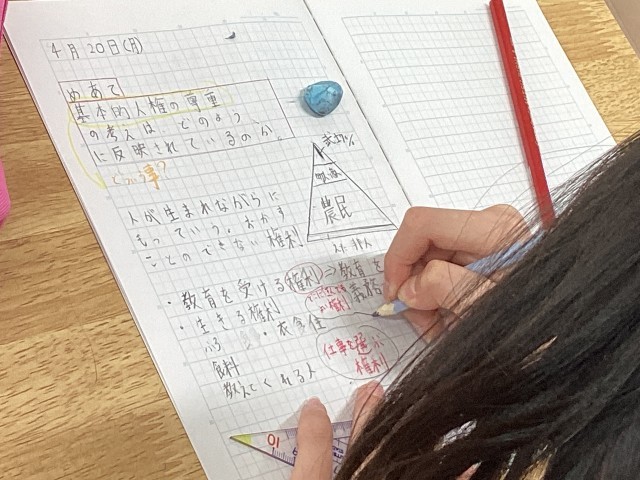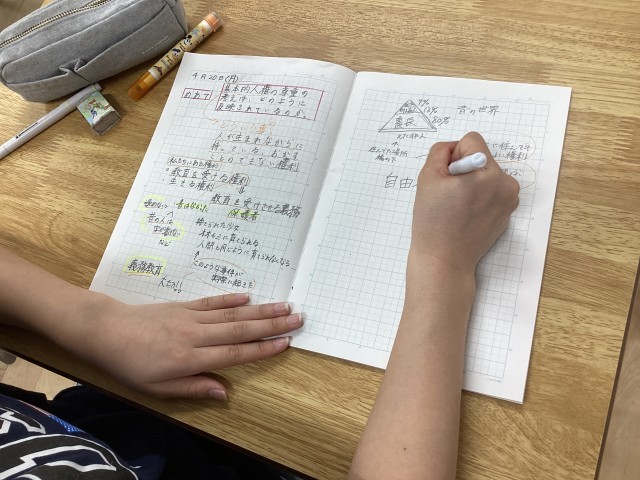 6年生の社会では「わたしたちのくらしと日本国憲法」の学習をしています。日本国憲法に書かれている「基本的人権の尊重」について学んでいます。人権とは「人が生まれながらにもっている権利」であること、基本的人権にはどのようなものがあるか(教育を受ける権利、職業を選ぶ権利、生きる権利・・・など)について、みんなで一緒に考えていきました。
