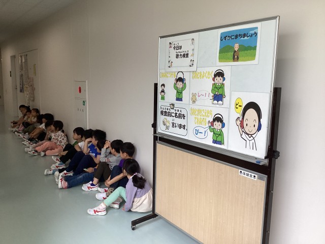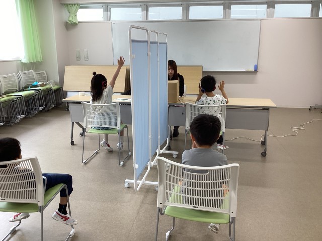 全児童の聴力検査をしています。高い音、低い音の聞こえを検査します。