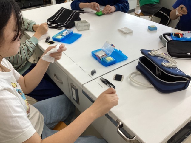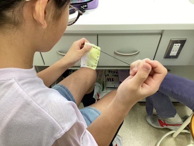 6年生の家庭科では、作品作りに入る前に手縫いの復習をしています。小さなミニ雑巾を作ることで、玉結び、なみ縫い、玉留めのやり方を再確認していました。