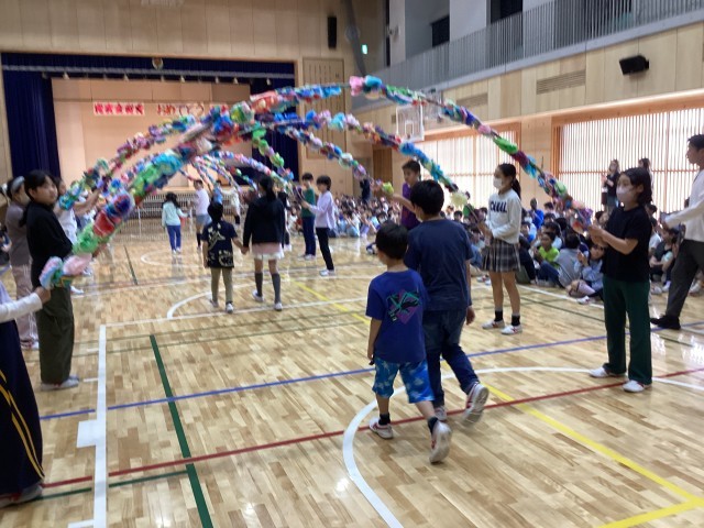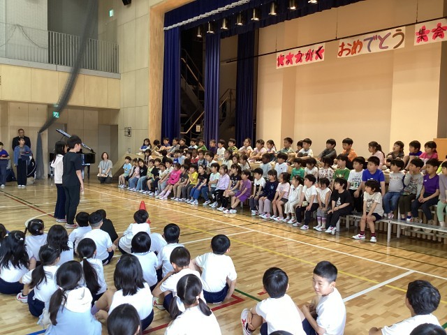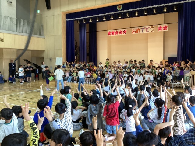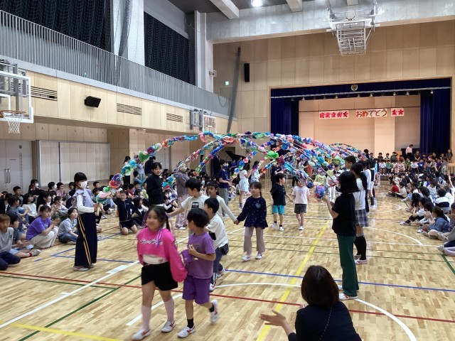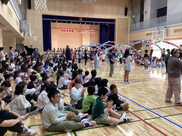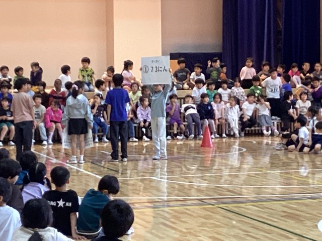 1年生の入学をお祝いして「入学お祝い集会」を全校の児童で行いました。1年生は6年生と手をつないで入場、舞台のひな壇にすわりました。代表委員のはじめの言葉の後には、1年生全員による自己紹介。マイクを持って自分の名前をいうことができました。その後クイズを行いました。「全校の児童は何人?」「先生たち教職員は全校で何人?」「(キャラクターが3つ示され)しもわんはどれでしょう?」という問題です。2年生以上の子達も一緒に楽しみました。最後には5年生が持つ花のアーチをくぐって、1年生が退場しました。短い準備期間ではありましたが、4、5、6年生の代表委員が企画から実施までをがんばりました。