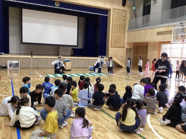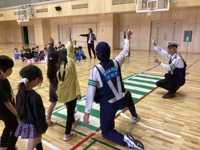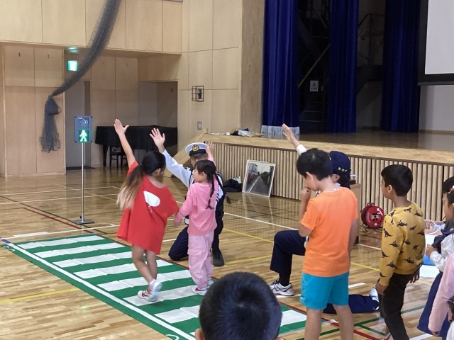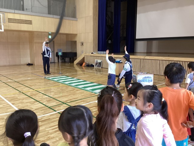 1年生は小岩警察の警察官の方をゲストティーチャーにお迎えし、歩行訓練を行いました。校外に出て学校の周りを歩きながら歩行者の交通規則を学ぶ予定でしたが、あいにくの雨だったので、体育館で行いました。道路の歩き方について話をうかがったのち、横断歩道の渡り方を実際にやってみました。信号が緑であることを確認、「右、左、右」を見て自動車が来ないことを確認、手を挙げて運転手に歩いていることを知らせる、渡っている時も周りに注意しながら歩くなど、警察官に声をかけてもらいながら歩いていました。