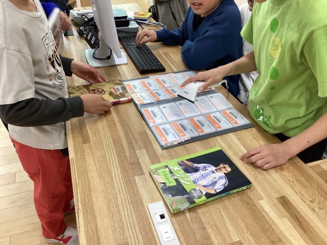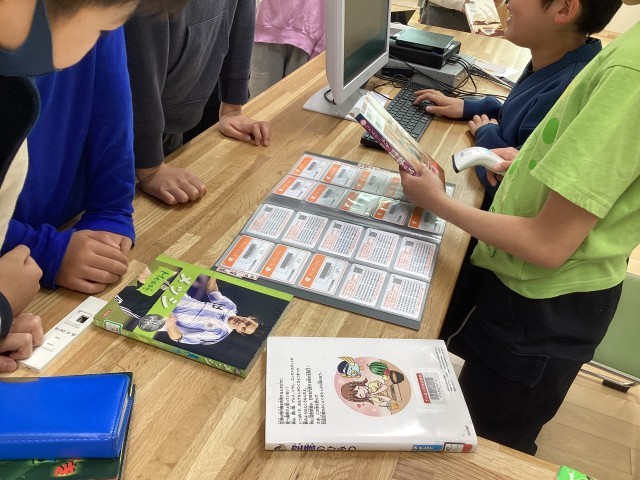 5年生は学校図書館読書センターで読書をしていました。本の貸し出しが始まりましたが、図書委員会の子が貸し出し手続きの作業をしていました。本はパソコンで管理されているので、バーコードリーダーでバーコードを読み取り、スムースに手続きをしていました。