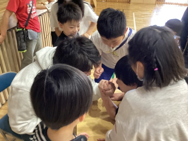 子ども達がクリアしなければならないポイントは、「おくろうWA」「先生とうでずもう」「10秒チャレンジ」「先生パズル(◯年◯組の先生はだれでしょう)」「誕生日でならぼう」などがありました。最後に「校長先生チェックポイント」でコンプリート。6年生がリードし、楽しく声をかけあいながら笑顔あふれるオリエンテーリングになりました。