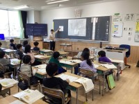 4年生は図工で「コロコロガーレ」というゲームを作っています。高い皿からビー玉を転がし、次第に下の段に落ちてきます。落ちる仕組みやビー玉の受け皿の模様を考えながら作成しています。