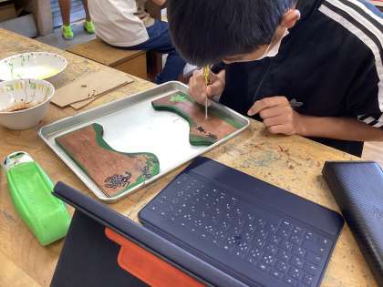 6年生は図工の「世界で一つのテープカッターを作ろう」の学習で、木工作に挑戦しています。2枚の板から切り出した部品に自分が考えたデザインで絵を描き、ネジや接着剤を使って組み立てます。筆だけでなく、スポンジを使ったり、細いドライバーの先を使って絵を描いたり、ニス塗りで仕上げをしたりして、これまで学習してきたことを活かして作っています。