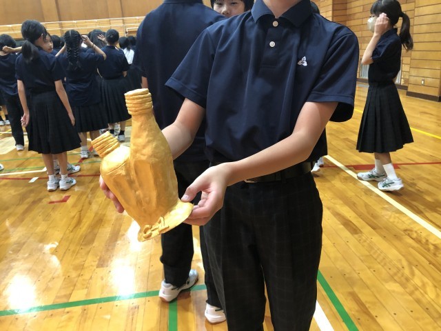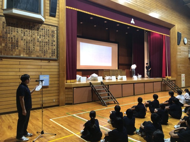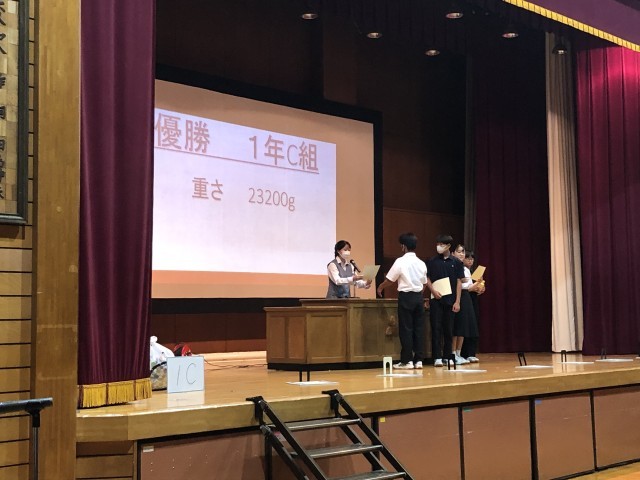 9月22日(月)に前期最後の生徒会朝礼が行われました。今回はペットボトルのキャップの回収量を競う「C1グランプリ」の結果発表でした。この取り組みは夏休み前から告知をし、休み明けから本格的に回収となりました。集めたキャップは(ポリオなどの)ワクチンに変える業者に引き取ってもらいました。生徒会本部役員が計画的に取り組んだ全校生徒対象の行事で結果発表の時は盛り上がりもありました。生徒による主体的な取り組みで、子どもたちの頑張りが見られた一面でした。