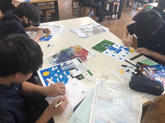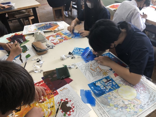 美術科の授業の様子を紹介します。「ステンドガラス」の製作を行っています。下絵のデザインにあうセロパンを切り取って台紙に張り付けていきます。生徒たちは、セロハンの切り抜きにはカッター(刃物)を使用しています。そのため、いろいろなことに配慮して活動していて、とても集中した雰囲気でした。完成披露がたのしみです。