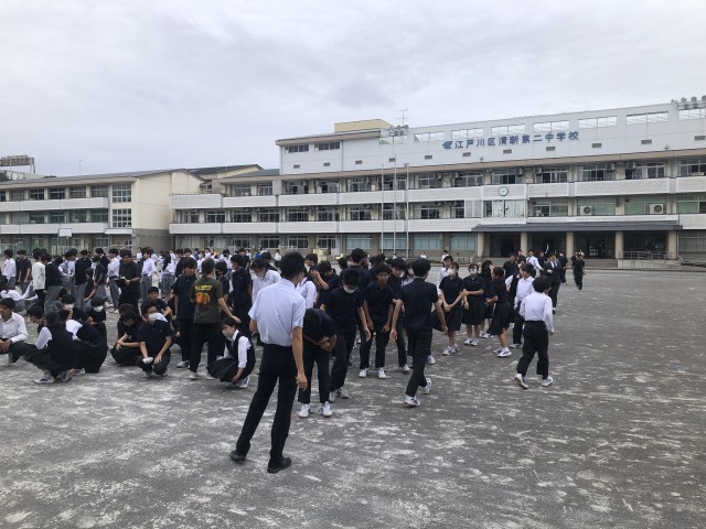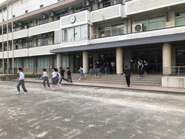 まずは机に潜って、自身の身の安全を確認しました。その後停電となり、教員の肉声でグラウンドに避難するというものでした。生徒たちは教員の指示のもと落ち着いて避難しました。避難は3分程度で完了しました。肉声の指示で全生徒が速やかに動いていくことは立派なことだと思います。また副校長の講評では、訓練当日に台風で八丈島が停電ななっていることを話題にしました。どんな状況下でも「お・か・し・も」の基本行動で避難していくことは自分の身を守る点では大事なことです。
