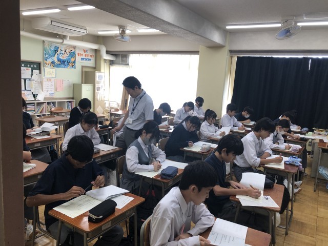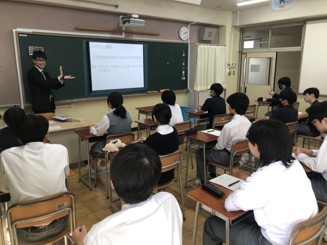 高校の先生による出前授業の「その2」として、今回は10月10日(金)の6時間目の様子を紹介します。この時間は私立校(関東第一・二松学舎大付属・昭和第一)の参考の先生の授業(英語・化学)でした。各校の先生方は独自の教材を持参し、生徒たちに提供して授業を進めていました。また1枚目の写真(授業)はその後と留学生と交流しました。