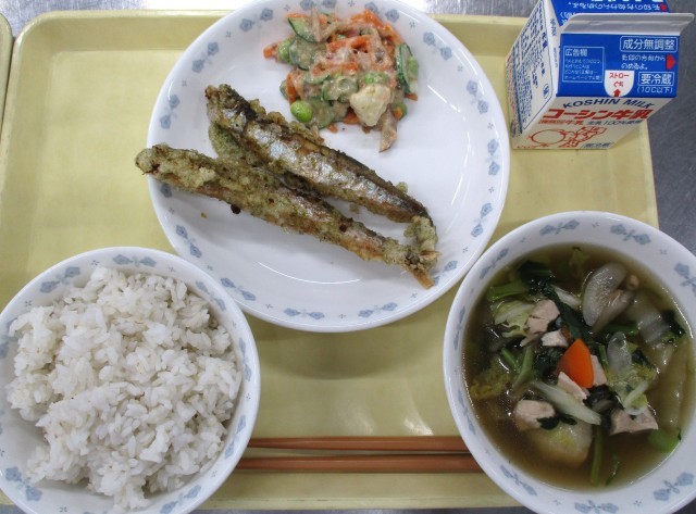 ごはん ししゃもの青のり揚げ いぶりがっこあえ きりたんぽ鍋 牛乳