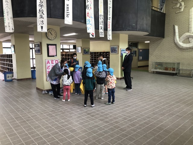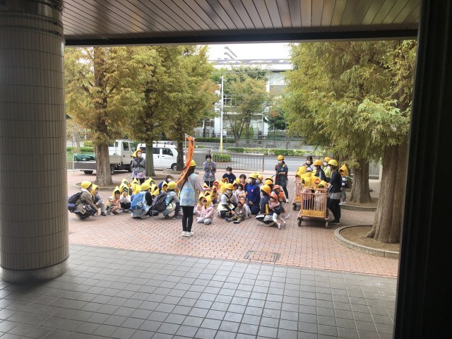 10月24日(金)の午前中に近隣の保育園児が来校しました。これは、年1回行われる「保育園の『避難訓練』」でした。この保育園は、災害時に本校を「避難場所」と定めているため、実際に避難を体験しました。訓練後は、年長児は校内に残り副校長が校舎を案内しました。
