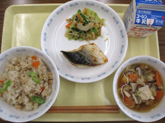 どんどろけめし 鯖の塩焼き ちくわ入り小松菜あえ じゃぶ 牛乳