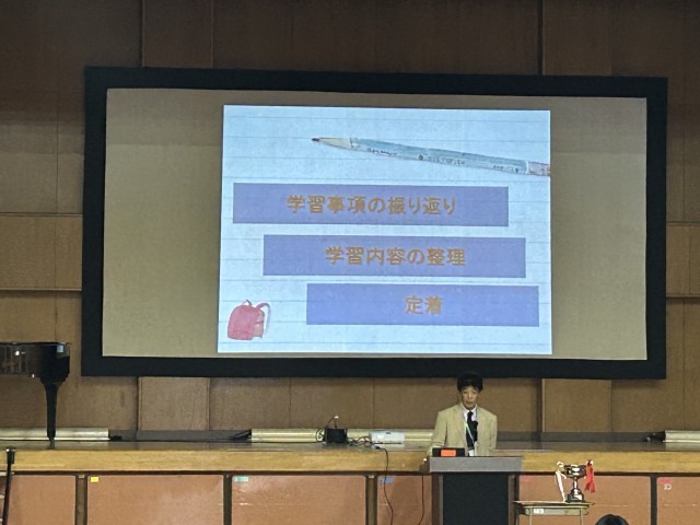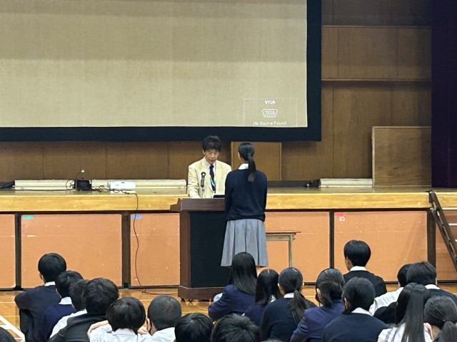 11月10日(月)に(11月の)全校朝礼が行われました。朝礼では、学校長が定期考査に向けた心構えや取り組み方法などに焦点を当てた講話をしました。また、その後部活動や国語科(読書間感想文・弁論発表大会)の表彰を行われました。