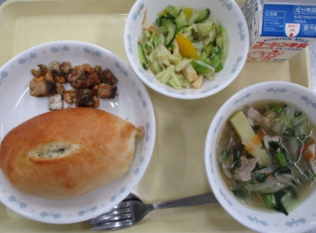 手作りガーリックパン 青のりフィッシュビーンズ イカのマリネサラダ ポテトと小松菜のスープ 牛乳