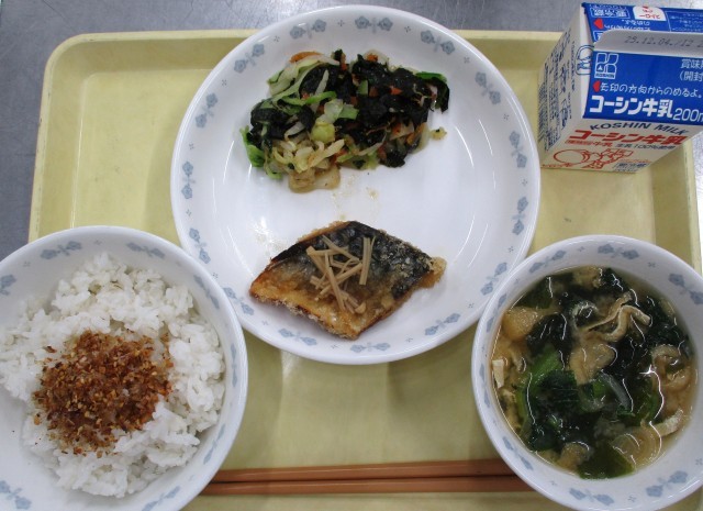 ごはん アーモンドふりかけ 魚の揚げ煮 磯和え わかめと油揚げの味噌汁 牛乳