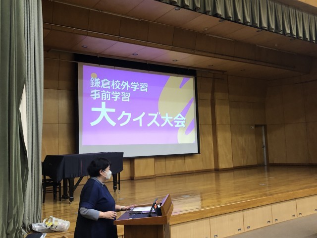 11月25日(火)の6時間目に2年生は、校外学習の事前学習会を行いました。その中で行動班対抗のクイズ大会がありました。問題は事前に調べた鎌倉の名所についてや今回のルールなどでした。どの班もよく学んでいて、クイズの正答率は高かったです。当日も楽しく学んで、これからの学校生活に生かしてほしいと思います。