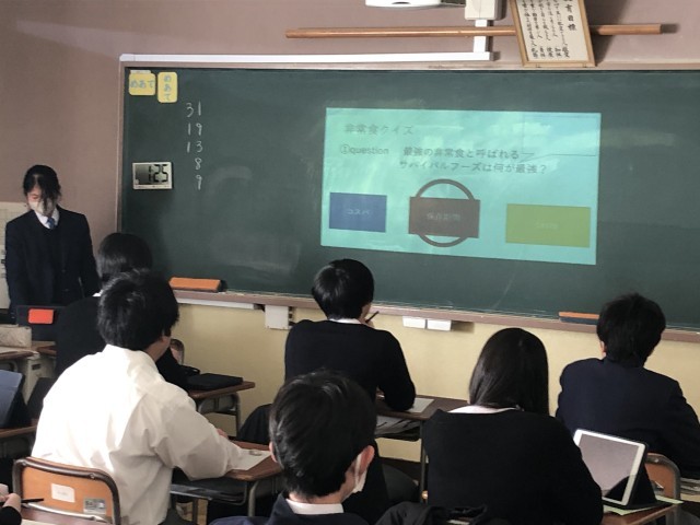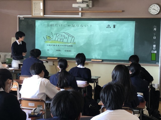 12月19日の総合防災訓練当日3年生は2つことを行います。1つは仮設トイレの設営、そして、防災のプレゼンです。そのプレゼンにむけて、学級の時間を使って各自の発表会を行っています。いろいろな切り口でテーマ(「防災」)に迫っています。当日が楽しみです。