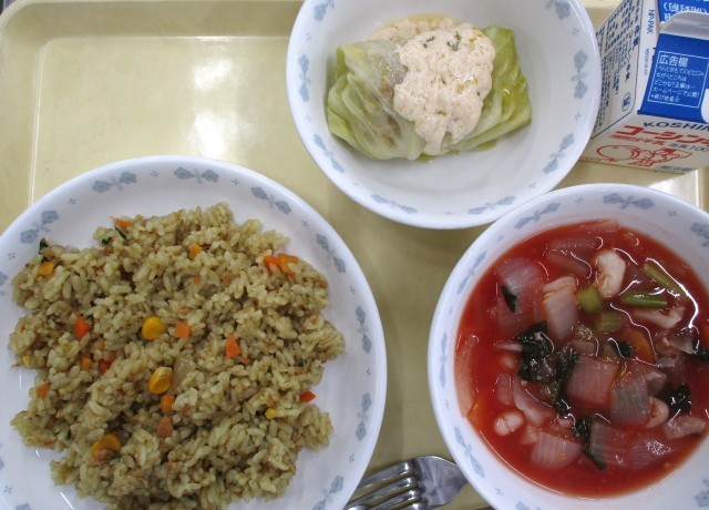 シーチキンピラフ 焼きロールキャベツ いんげん豆のスープ 牛乳