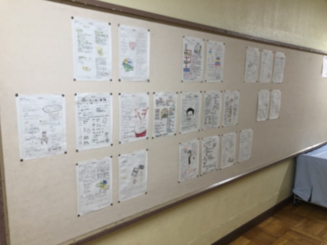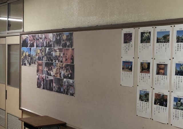 廊下の掲示の様子を紹介します。1枚目の写真は職員室前に新しく設置した「朝日新聞ニュース」です。掲載記事は毎週変わります。2枚目の写真は2年生の掲示です。鎌倉校外学習の写真と振り返り川柳が貼られています。3枚目の写真は1年生の進路学習レポートです。職業調べのレポートを掲示しています。特にレポート等の掲示は、仲間の作品を見て自分を振り返り、次回への工夫という発展があるものです。生徒全員のクォリティーが向上していくことを願っています。