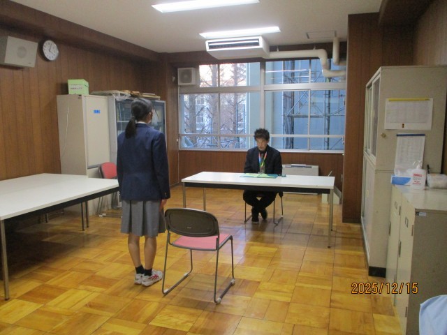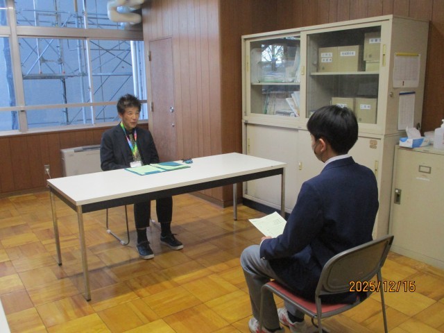 「冬至」が過ぎ、これからは日の出の時刻が少しずつ早くなり、「春」に向かっていきます。さて、3年生は現在校長による面接練習を行っています。1月下旬から始まる高校入試の本番に向けてのものです。面接練習は学年で行われていますが、練習のために校長が面接官となり、練習をしています。生徒は事前に考えた「志望動機」や「高校3年間の過ごし方」などをわかりやすく伝えています。公的な雰囲気で他者と話すという経験を積ませていくことは、とても大事なことと捉えています。面接本番、堂々とした姿勢で面接の臨んでいくことを大いに期待しています。