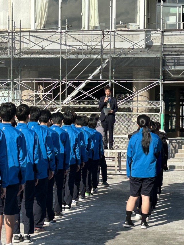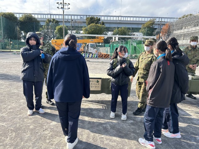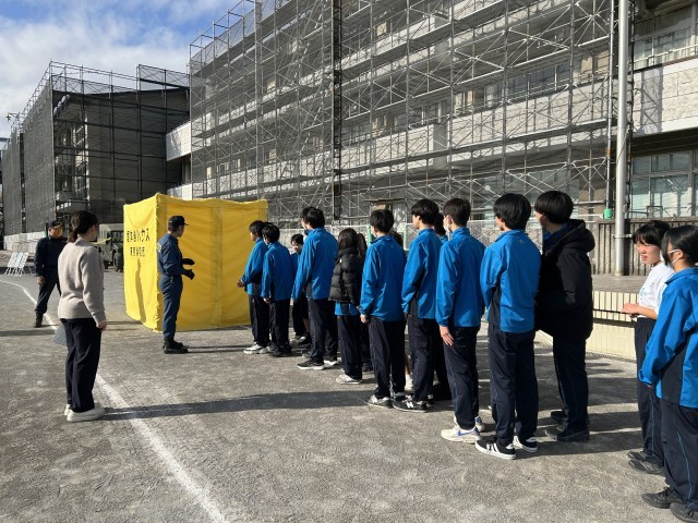 総合防災訓練の第2回目は開会式から生徒の防災体験の様子です。煙の激しさなどを学びました。火災を想定した避難訓練では、ハンカチなどなどの利用を促しています。なぜ、利用しなければならないのかを実体験できたと思います。