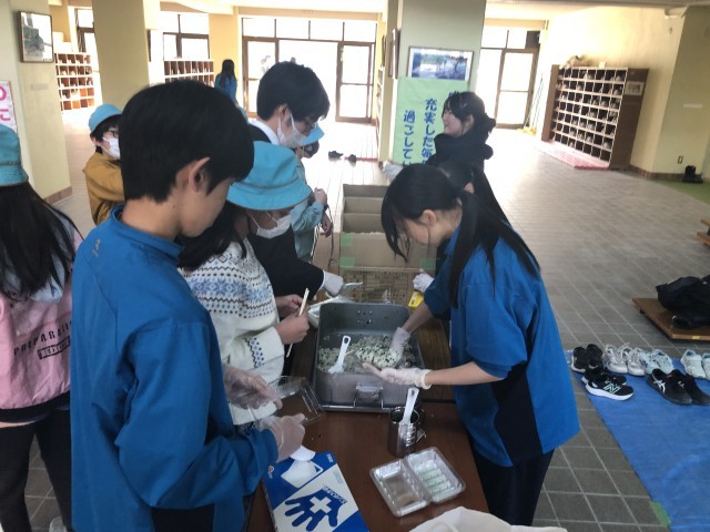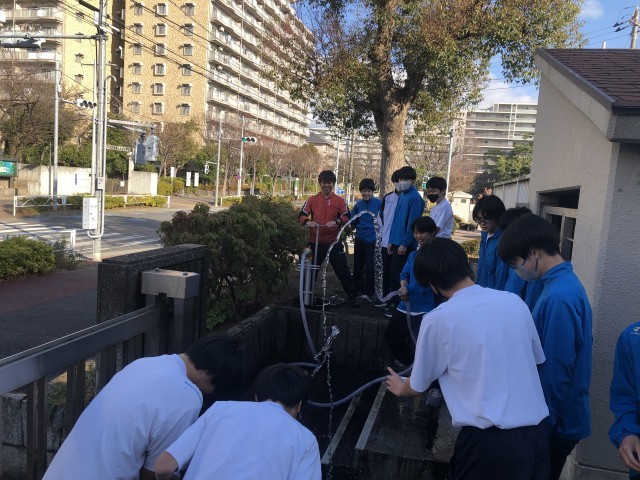 総合防災訓練の5回目(最終回)です。今回は、非常食の支給と備蓄水道、および閉会式の様子です。非常食として本校にアルファー化米は備蓄されています。また水道は地下に埋められている備蓄タンクからの配水で専門器具を装着していきます。