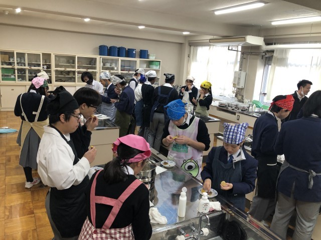 2学期終業式の週の3年家庭科の時間は調理実習を行いました。今回は調理方法について学びました。具体的には、さつまいもを蒸し器と電子レンジを使って蒸した場合の違いを学びました。生徒たちは2つの方法でさつまいもを調理し、その後食べ比べなどして、甘さや硬さなどの違いを観察しました。調理自習にいうこともあり、当日は多くの先生方が授業を観察し、生徒と共に食べ比べし、共に学びました。自分が生きる上で「食」は大事なことです。今回の学びをこれからの人生に生かしていってほしいと思います。