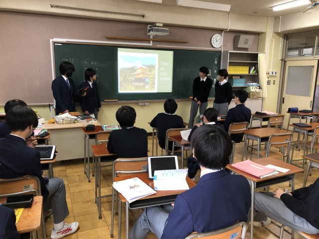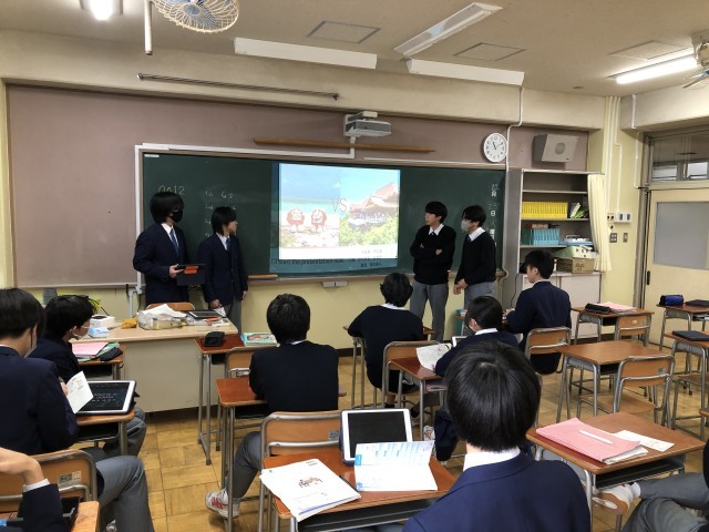 今回は英語の授業の様子を紹介します。英語の授業はコミュニケーション能力を高めることを目標として幅広い取り組みを行っています。3年生は英語によるプレゼン活動をしています。ALTの指導の下、映像を活用してのグループ活動でした。テーマは「どちらがよいか」という対比だったので、それぞれの良さを聞き手に伝えていました。着眼点がとても興味深かったです。チャレンジや習慣化を大事にして、英語の語学力を向上させてほしいと思います。