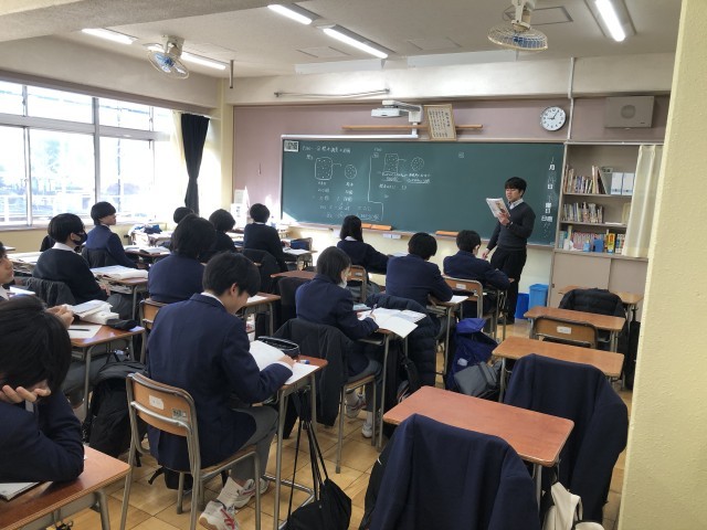 今回は数学です。数学も英語同様3展開(3人の先生による指導)を行っています。3年生2クラスを3つに分けての指導です。メンバーは定期的に変わります。一人ひとりの理解度を確認しながら授業を展開しています。