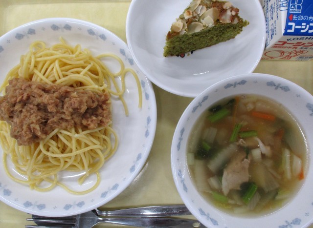 練馬スパゲティ ポテトと野菜のスープ 小松菜ケーキ 牛乳