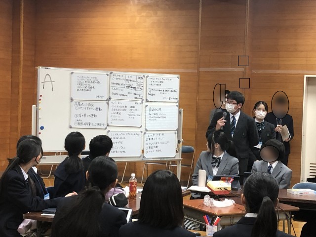 生徒長会交流会の2回目です。後半はSGDに関する各校からの提言等の交流でした。グループでの交流後、本校の生徒会長が、グループのまとめを他に説明しています。近隣校の生徒会役員との交流もあり、学校間の交流になど、様々なことが考えられる会となりました。本校生徒会の益々の発展を期待しています。