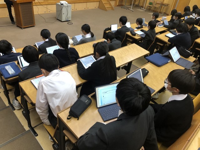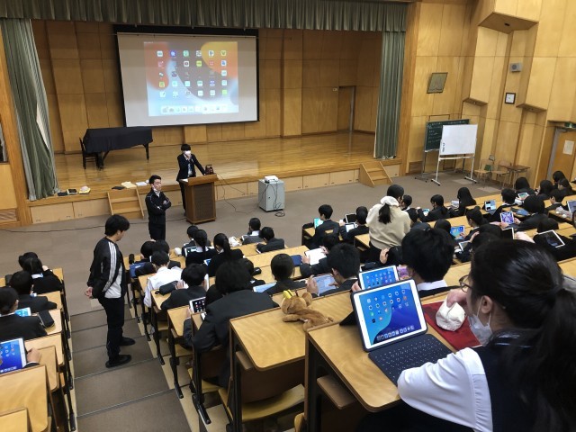 次年度から新しい「iPad」になるため、その入替に伴う事前作業が行われました。計画は、現機種を回収して、新機種に入替えます。そのため、事前準備として個人データなどを新機種に移し替えなければなりません。そのガイダンスでした。操作説明・事前準備等は本校のICT支援員の先生が主に生徒に指導を行いました。円滑にデータ移行等が行われて、スムーズに進んでいくことを願っています。