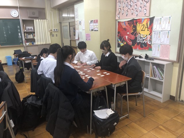 2年生の国語の授業の様子です。古典や和歌の学習の延長線で百人一首を授業で扱います。まずは和歌を覚えていくことから始めて、実際の百人一首へとなります。最近は3人一組の「源平戦」という形態で行うことが主流となっています。2年生はこの学習を通して、2月6日(金)に(学年)百人一首大会を行いました。この様子は、改めて紹介します。
