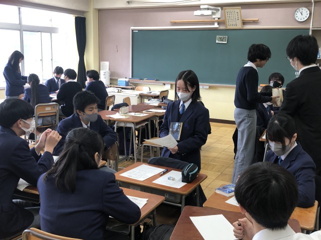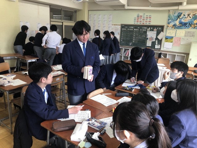 3年ビブリオ発表 公開日 2026/03/10 更新日 2026/03/07 できごと 3月6日(金)の3・4校時に3年生はビブリオ学級発表会を行いました。これは、自分が今までに読んだお気に入りの書籍の良さを周囲に伝えていく活動です。各クラスで選抜された生徒は3月7日(土)に行われる学年発表に臨みます。生徒たちは、朝自習(読書)等で読んだ小説や実用書などさまざまな書籍の良い点を上手にプレゼンしていました。