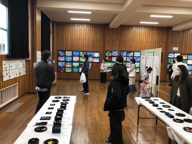学校公開教科作品展会場での保護者の鑑賞の様子です。